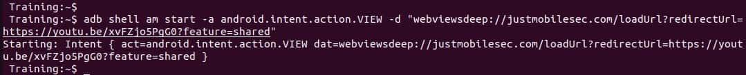 $ adb shell am start -a android.intent.action.VIEW -d "webviewsdeep://justmobilesec.com/loadUrl?redirectUrl=https://youtu.be/xvFZjo5PgG0?feature=shared"
